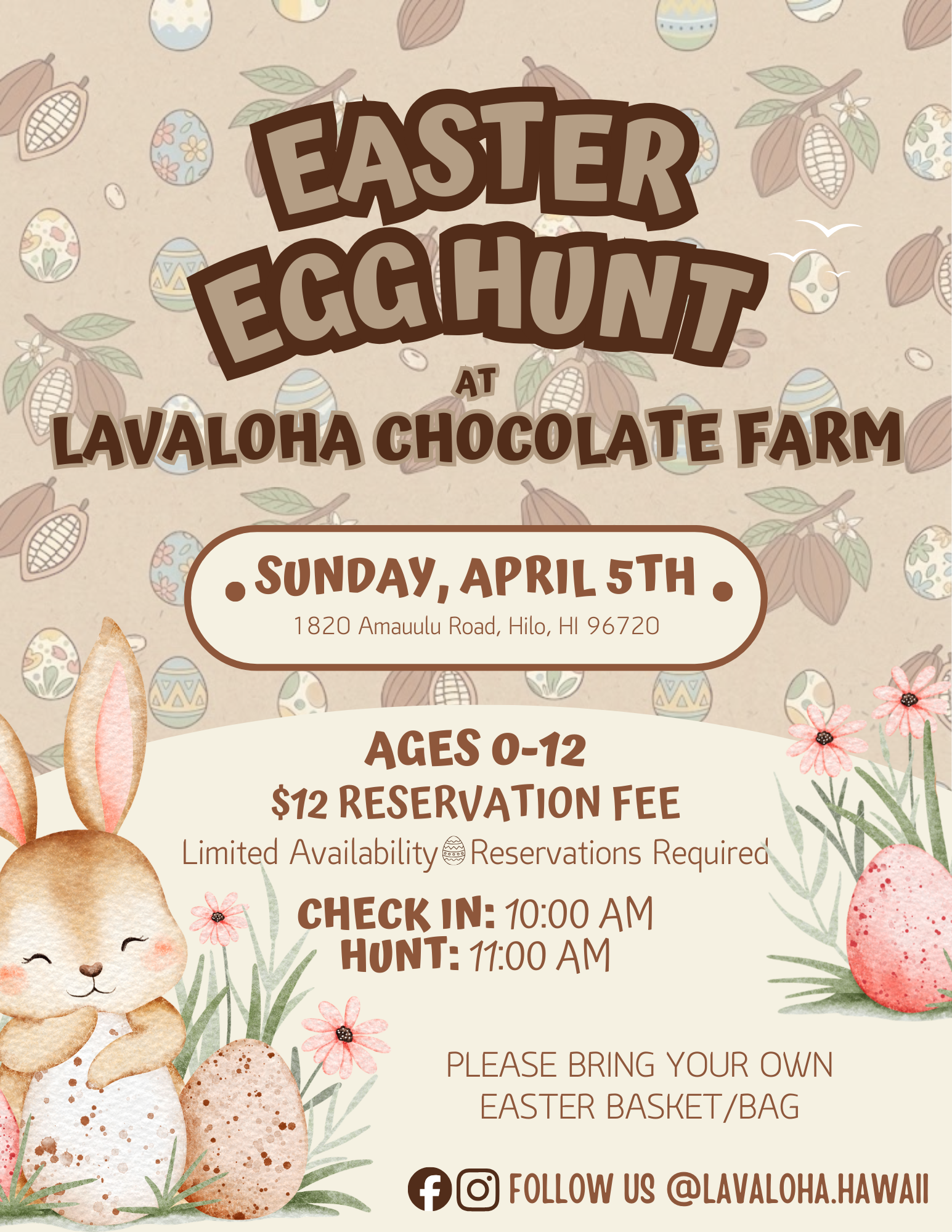 Join us for some Easter Family Fun on our chocolate farm with an Easter Egg Hunt and yard games! We will also have prizes, snacks, and the Easter Bunny, so be sure to reserve* your spot early!